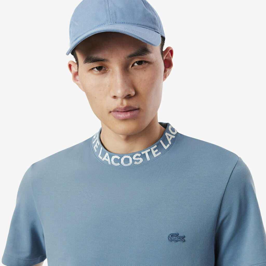 O design é complementado pela gola redonda com a inscrição "LACOSTE" em destaque e o icônico crocodilo bordado no peito.
